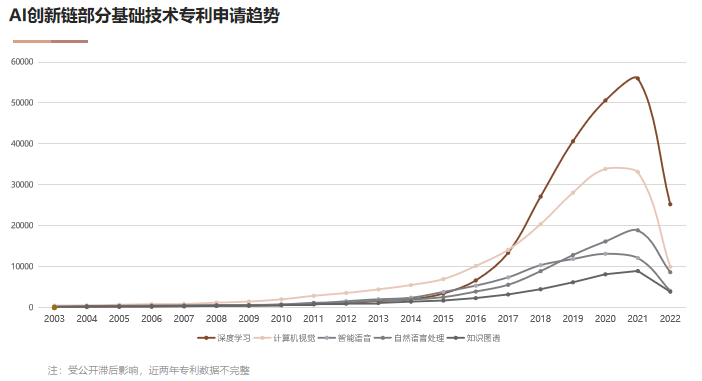 近日,国家工业信息安全发展研究中心、工信部电子知识产权中心发布了《AI创新链产业链融合发展赋能数字经济新时代—中国人工智能专利技术分析报告(2022)》(以下简称“报告”)。报告显示,截至2022年9月,我国深度学习、智能语音、计算机视觉、自然语言处理、知识图谱领域申请相关专利分别为23万余件、8万余件、18万余件、8万余件、4万余件,专利申请呈现稳步增长的态势,百度公司、腾讯公司、国家电网、华为公司四家互联网、科技企业在上述技术领域表现较为突出。报告显示,在众多基础技术中,因计算机视觉技术起步较早,在人工智能技术早期发展中,起到了重要的作用。但2013年以后,伴随多层神经网络技术的突破,基于反向传播算法的深度学习技术有了质的飞跃,在技术与政策双红利的推动下,深度学习相关专利数量也呈现爆发式增长,2016-2021年深度学习专利申请年均复合增长率达到53%,对人工智能的引领作用开始逐步凸显。随着近年来自然语言处理技术在智慧城市、智慧交通、智慧医疗等各种应用场景的广泛应用,自2017年起相关技术创新开始提速,2021年自然语言处理的专利申请量仅次于深度学习和计算机视觉,发展势头强劲。