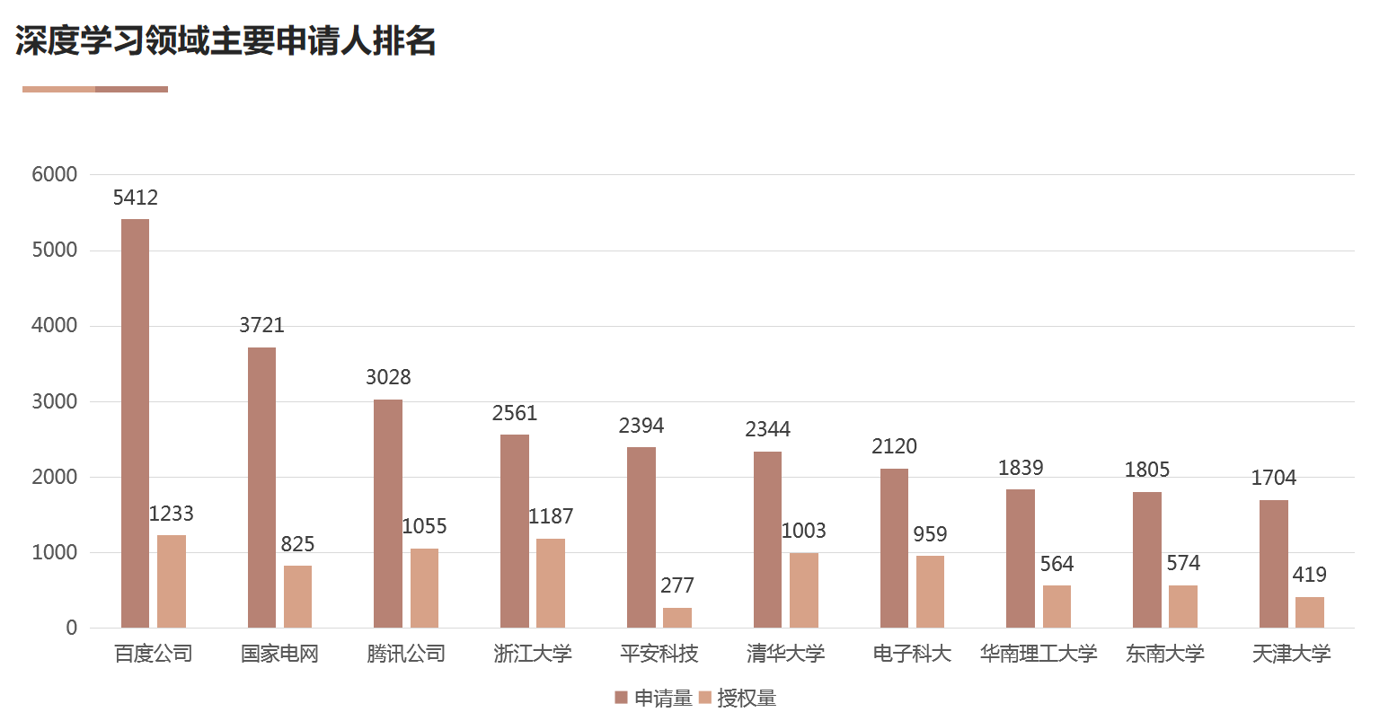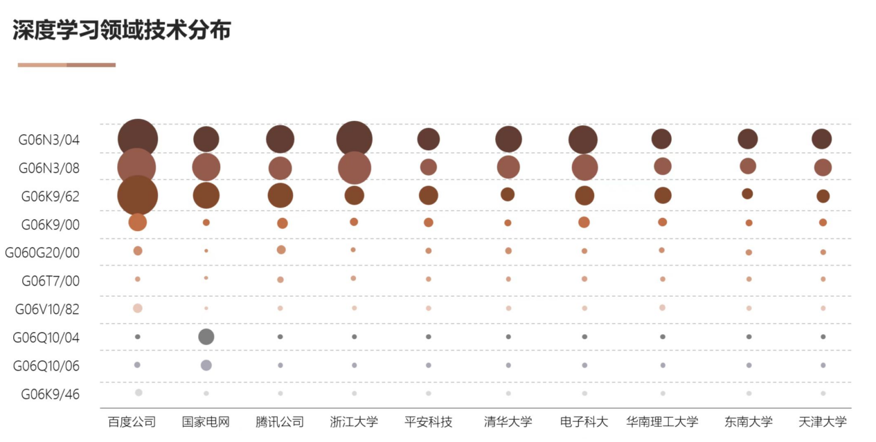 报告显示,深度学习领域专利申请量百度公司、国家电网、腾讯公司专利储备雄厚,专利申请量均超过3000件。同时,高校申请人的专利申请量也具备一定优势,浙江大学、清华大学、电子科大专利申请量均超过2000件,显示我国高等院校凭借深厚的理论基础和丰富的研究资源,对作为人工智能基础通用技术的深度学习具有巨大贡献。从技术分布上看,深度学习技术集中度较高,主要集中在G06N3/04(体系结构,例如,互连拓扑)、G06N3/08(学习方法)和G06K9/62(应用电子设备进行识别的方法或装置)三个分支。