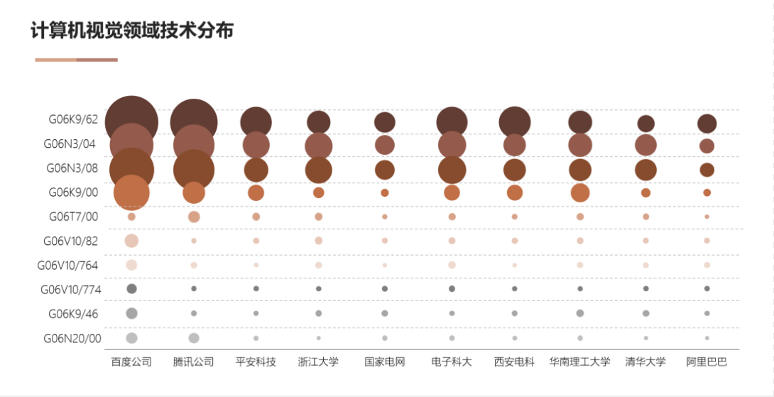报告显示,计算机视觉领域专利申请量百度公司、腾讯公司专利申请量均超过3000件,反映了上述企业在计算机视觉领域技术的丰厚积累,具备一定的专利技术竞争力。与此同时,西安电科、电子科大两所高校在该领域表现也较为突出,专利申请量均超过1400件。从技术分布上看,计算机视觉技术主要集中在G06K9/62(应用电子设备进行识别的方法或装置)、G06N3/04(体系结构,例如,互连拓扑)G06N3/08(学习方法)和G06K9/00(用于阅读或识别印刷或书写字符或者用于识别图形,例如,指纹的方法或装置)四个技术分支。