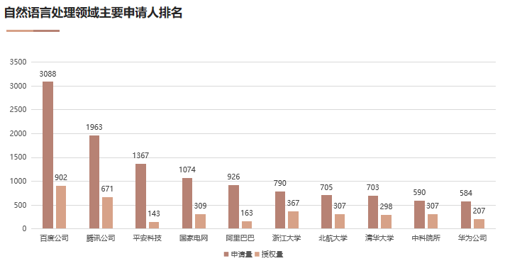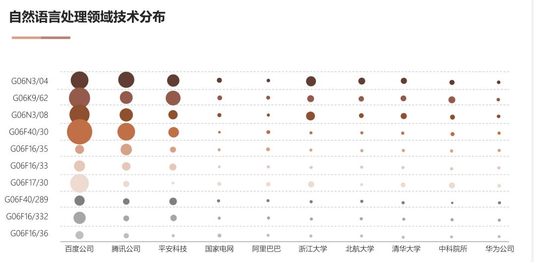 报告显示,自然语言处理领域专利申请量百度公司、腾讯公司、平安科技专利申请量均超过1300件,专利技术积累丰厚,形成了一定的技术竞争力。从技术分布上看,自然语言处理所涉及的分支较为分散,涵盖了多个技术方向,如G06N3/08(学习方法)、G06K9/62(应用电子设备进行识别的方法或装置)、G06F40/30(语义分析)等。