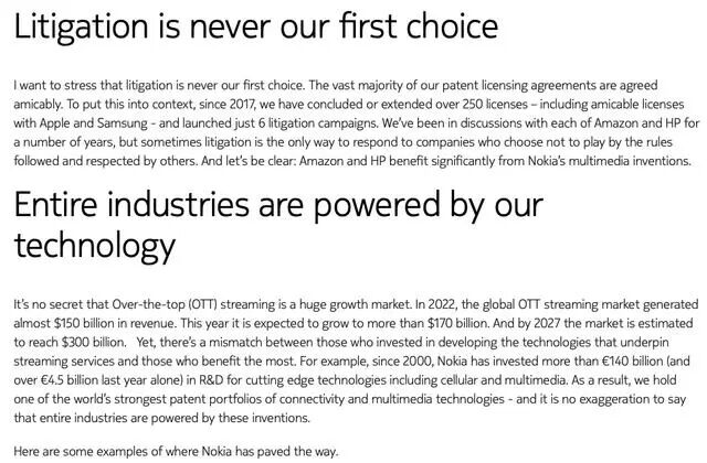 诺基亚表示,长期以来亚马逊一直使用诺基亚专利的技术进行视频压缩、内容交付和内容推荐等内容,而惠普也公然违反了诺基亚的专利流媒体技术,并不愿意支付“合理的费用”,因此诺基亚决定起诉这两家公司。