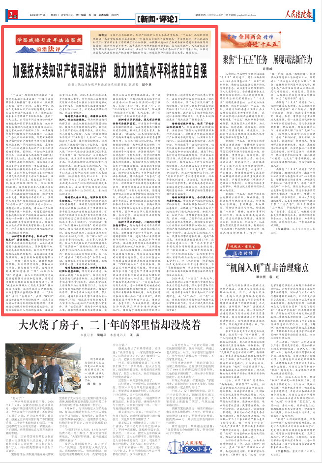 习近平总书记强调,知识产权保护工作关系高质量发展。“十五五”规划纲要明确提出“高质量发展取得显著成效”“科技自立自强水平大幅提高”等主要目标,为人民法院知识产权审判的未来工作明确了目标和任务。加强技术类知识产权司法保护是有效激励保障科技创新、维护市场公平竞争、服务高水平对外开放的重要手段。在司法实践中,人民法院应如何加强技术类知识产权司法保护?在4月26日全球第26个世界知识产权日到来之际,本报特邀最高人民法院知识产权法庭分党组副书记、副庭长郃中林撰写署名文章,敬请关注。