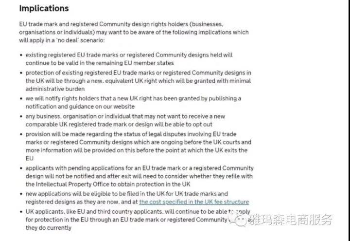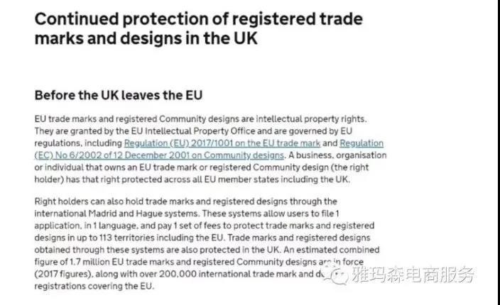 对于英国正式脱欧后欧盟商标及欧盟外观设计的效力及其他相关问题,该通知做出了如下重要规定:
