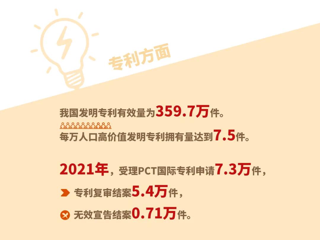 第一,专利方面。我国发明专利有效量为359.7万件。其中,国内(不含港澳台)发明专利有效量270.4万件。每万人口高价值发明专利拥有量达到7.5件,较上年提高1.2件。2021年,受理PCT国际专利申请7.3万件,其中国内申请人提交6.8万件。专利复审结案5.4万件,无效宣告结案0.71万件。