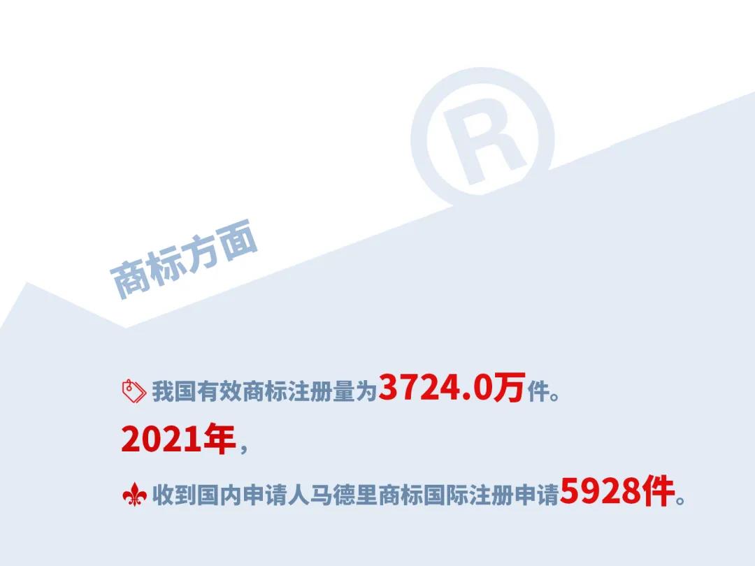 第二,商标方面。我国有效商标注册量为3724.0万件。2021年,收到国内申请人马德里商标国际注册申请5928件。完成商标异议案件审查16.4万件,完成各类商标评审案件审理38.3万件。
