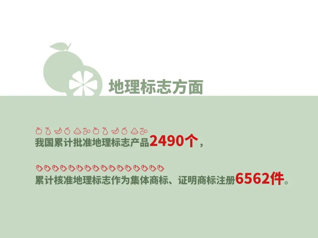 第三,地理标志方面。我国累计批准地理标志产品2490个,累计核准地理标志作为集体商标、证明商标注册6562件。