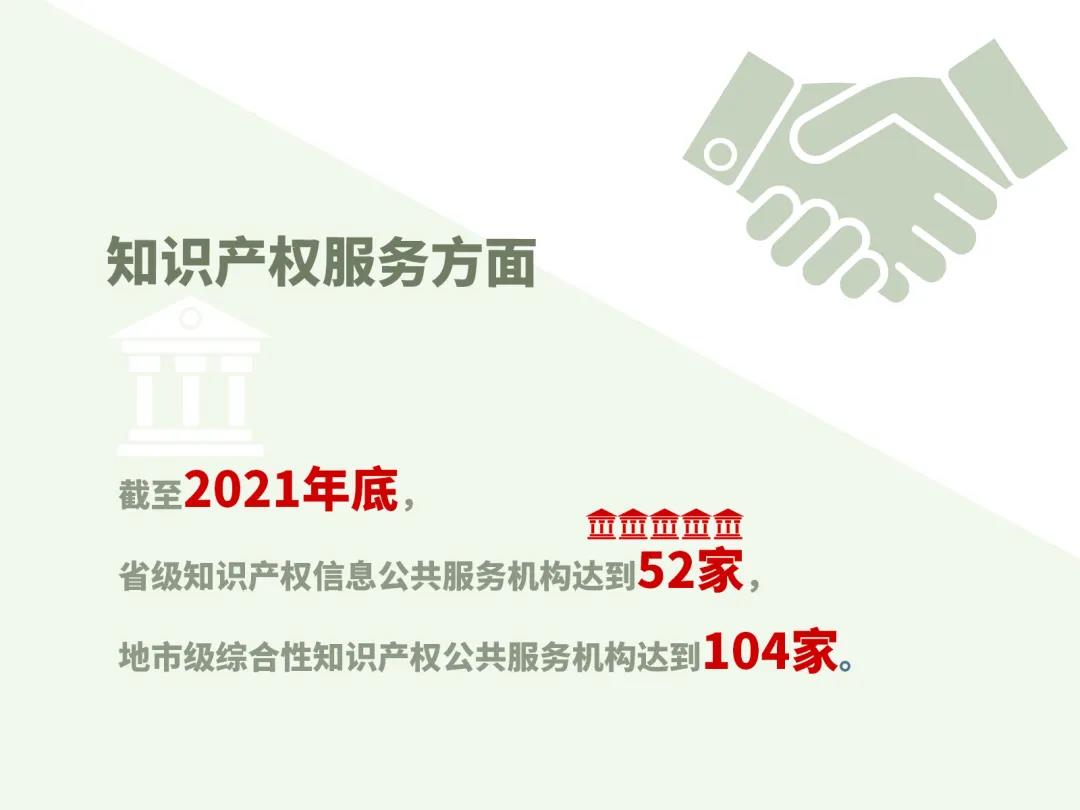 截至2021年底,全国31个省(区、市)全部实现专利商标业务“一窗通办”,省级知识产权信息公共服务机构达到52家,地市级综合性知识产权公共服务机构达到104家。