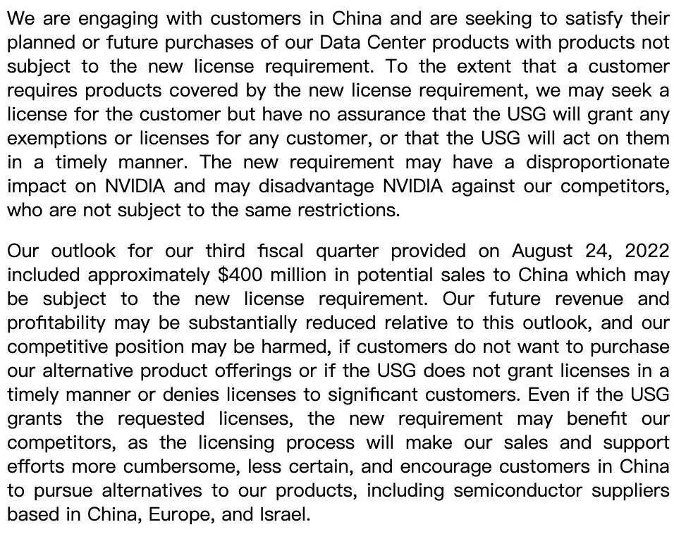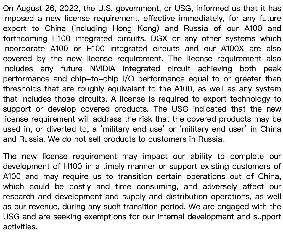 2022年8月26日,美国政府通知我们,它对我们未来向中国(包括香港)和俄罗斯的A100和即将推出的H100芯片的任何出口实施了新的许可要求,立即生效。DGX或任何其他包含A100或H100芯片和我们的A100X系统也包括在新的许可证要求中。许可要求还包括未来其峰值性能和芯片到芯片I/O性能均等于或大于大致相当于A100阈值的任何英伟达芯片,以及包含这些芯片的任何系统。美国政府表示,新的许可要求将解决涉及的产品可能用于或转移到中国和俄罗斯的“军事最终用途”或“军事最终用户”的风险。我们不向俄罗斯的客户销售产品。新的许可要求可能会影响我们及时完成H100的开发或支持A100现有客户的能力,并可能要求我们将某些业务转移到中国以外。这可能会花费昂贵且耗时,并在任何这样的过渡期内对我们的研发、供应和分销业务以及我们的收入产生不利影响。我们正在与美国政府合作,并正在为我们的内部开发和支持活动寻求豁免。我们正在与中国的客户接触,并寻求满足他们计划或未来购买我们的数据中心产品不受新的许可要求。如果客户需要新许可要求涵盖的产品,我们可以为客户申请许可,但不保证美国政府会为任何客户授予任何豁免或许可,也不保证美国政府会及时对其采取行动。新要求可能会对英伟达产生不成比例的影响,并可能使英伟达在与我们的竞争对手的竞争中处于不利地位,我们的竞争对手没有受到同样的限制。我们于2022年8月24日提供的第三财季展望。其中有对中国大约4亿美元的潜在销售可能会受到新的许可证要求的限制。如果客户不愿购买我们的替代产品,或者美国政府不及时授予许可或拒绝向重要客户授予许可,我们未来的收入和盈利能力可能会大幅下降,我们的竞争地位可能会受到损害。即使美国政府批准了所要求的许可,新规也可能使我们的竞争对手受益,因为许可过程将使我们的销售和支持工作更加繁琐、不确定,并鼓励中国客户寻求我们产品的替代品,包括中国、欧洲和以色列的半导体供应商。