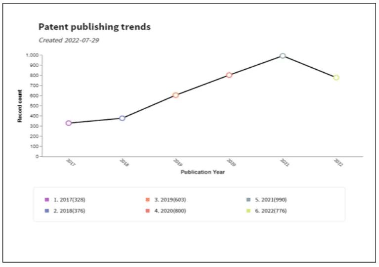 图2:2017年至2022年(7月)印度电动汽车技术专利公布趋势(德温特世界专利指数)