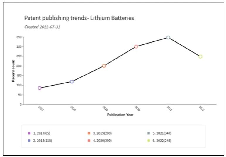 图4:2017年至2022年印度电动汽车锂电池专利公布趋势(出自《德温特世界专利指数》)