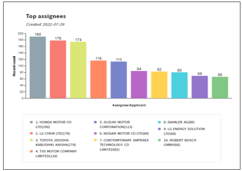 图3:印度电动汽车相关专利的10大受让人或申请人(出自《德温特世界专利指数》)