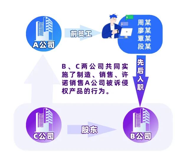 A公司发现,B公司和C公司未经许可制造、销售、许诺销售侵害A公司该外观设计专利权的产品。还发现,曾从事A公司模拟除颤仪相关项目研发的前员工周某、廖某、覃某、段某先后离职,2个月内即首次持股B公司,并从事相关职务。A公司遂起诉至广州知识产权法院,请求法院判令B、C两公司停止侵权行为,赔偿经济损失等。